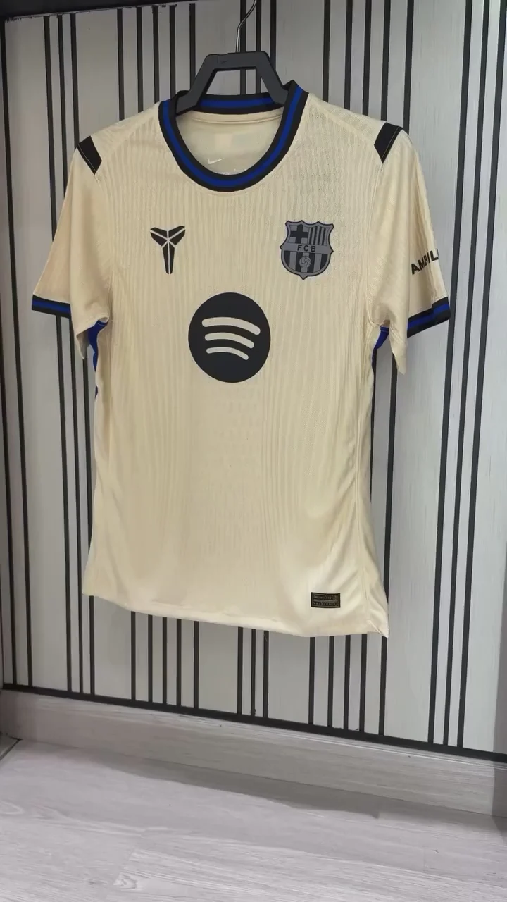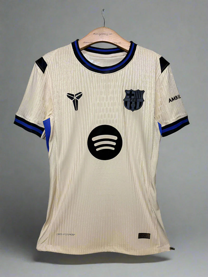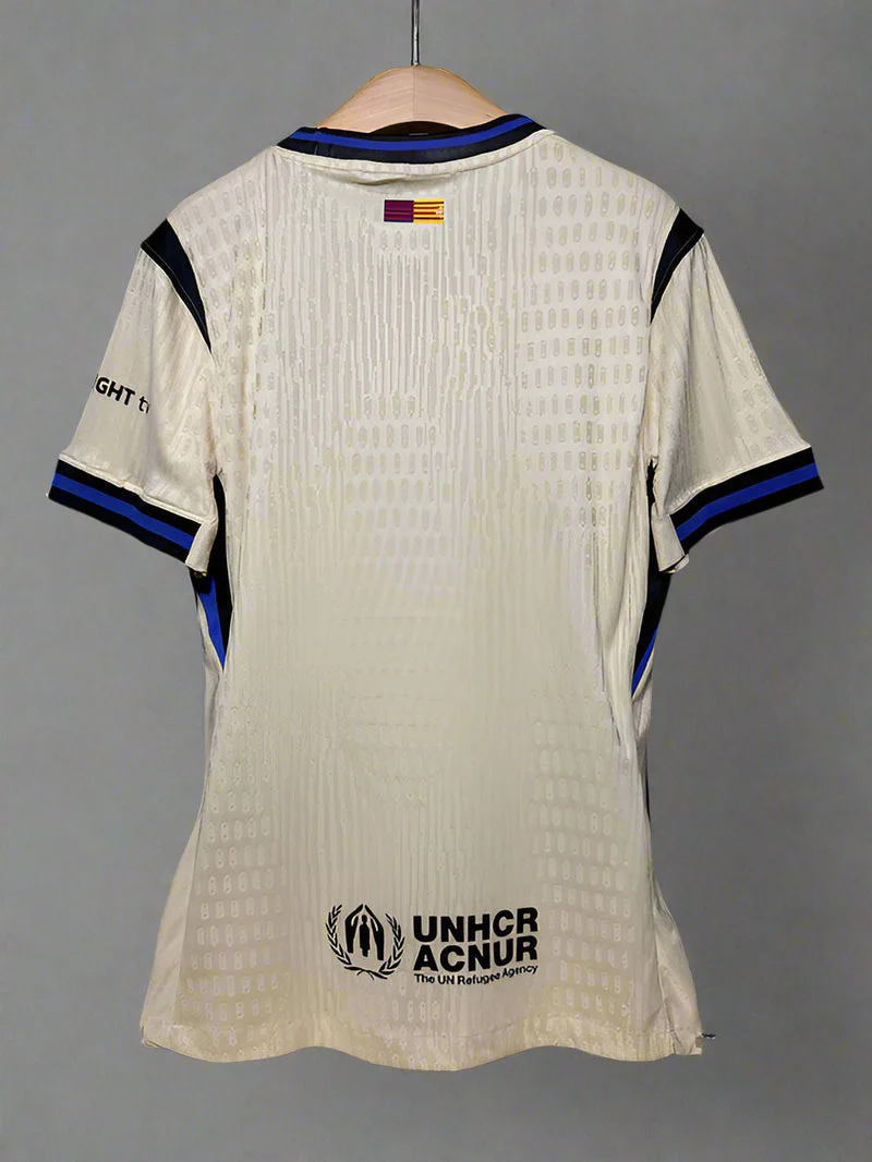 Step into the new season with the FC Barcelona 2025–26 Away Jersey (Player Version) — a perfect blend of authenticity, comfort, and performance. Designed with a slim, athletic fit, this player edition jersey mirrors what the professionals wear on the pitch. The lightweight, breathable fabric ensures moisture control, keeping you cool and comfortable whether you’re playing, training, or cheering from the stands. The elegant cream base with black and blue accents makes this away kit stand out, while premium printing highlights the iconic Barça crest, sponsor logos, and sleeve details.
